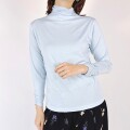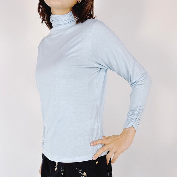 デザインはボトルネックのプルオーバーでベーシックなデザイン。薄手の生地ですが身幅を少しゆったり作って極端に身体の線を拾わない1枚でも着やすいサイズ感です。